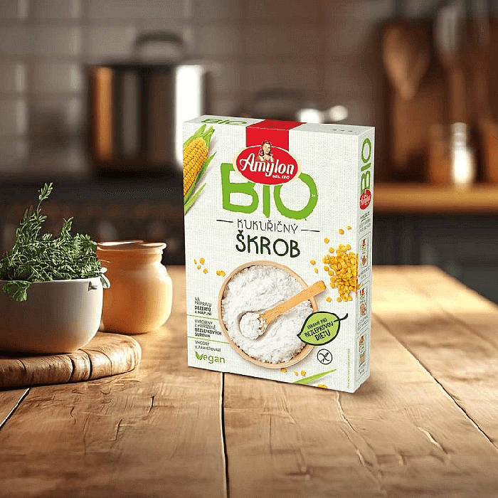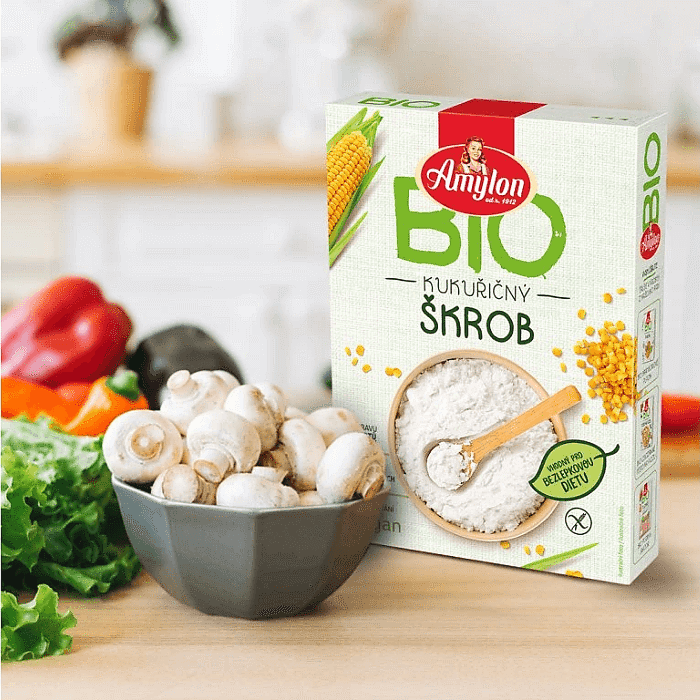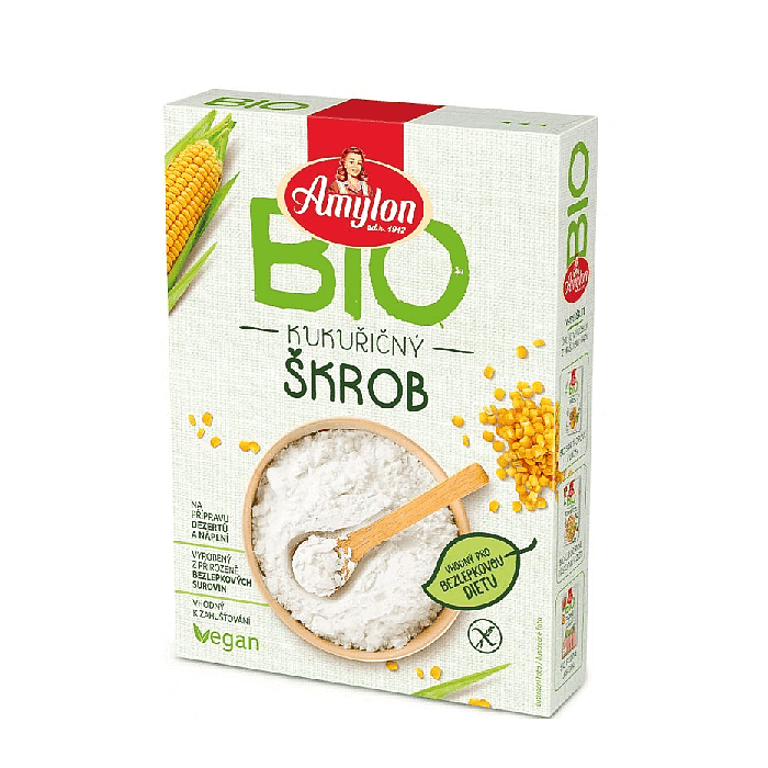 Kukuřičný škrob pochází z řad BIO produktů české značky AMYLON. Má jemnou, lehce práškovou konzistenci a neutrální chuť. Pomáhá vytvářet jemnou texturu u omáček a krémů a zajišťuje pevnější strukturu těst při pečení, což oceníte například u bábovek, sušenek nebo nepečených dortů.