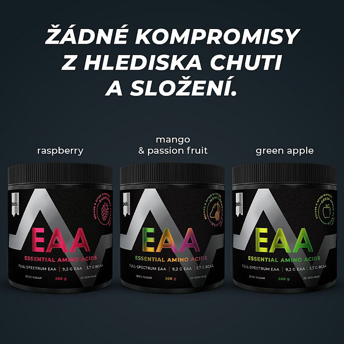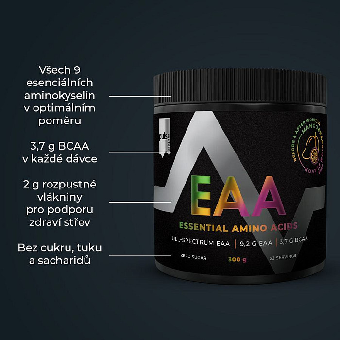 SEVERSKÁ KVALITA BEZ KOMPROMISU Podpořte růst svalů a regeneraci s naším Full-Spectrum EAA práškem. Každá porce dodá 9,2 g esenciálních aminokyselin, včetně 3,7 g BCAA, které jsou klíčové pro syntézu svalových bílkovin, výkon a ochranu svalové hmoty. Tato formule je bez cukru a je navržená tak, aby pomáhala předcházet svalovému rozpadu, zvyšovala výkonnost a urychlovala regeneraci. Osvěžující příchuť mango a mučenka potěší bez zbytečných kalorií – bez tuku a bez sacharidů. Přidaná vláknina navíc podporuje správné trávení a celkový komfort při užívání. Ideální pro užívání před, během nebo po tréninku. Pro kompletní regeneraci doporučujeme po tréninku zařadit plnohodnotné jídlo. Pokud potřebujete rychlé doplnění živin, sáhněte ihned po tréninku po proteinovém nebo regeneračním nápoji, který pomůže doplnit zásoby bílkovin a glykogenu. Full-Spectrum EAA – čistá podpora výkonu, ochrana svalů a rychlejší regenerace. Žádné kompromisy z hlediska jedinečné chuti a složení. Finská značka PULS NUTRITION patří ve všech ohledech k absolutní špičce sportovní a doplňkové výživy.