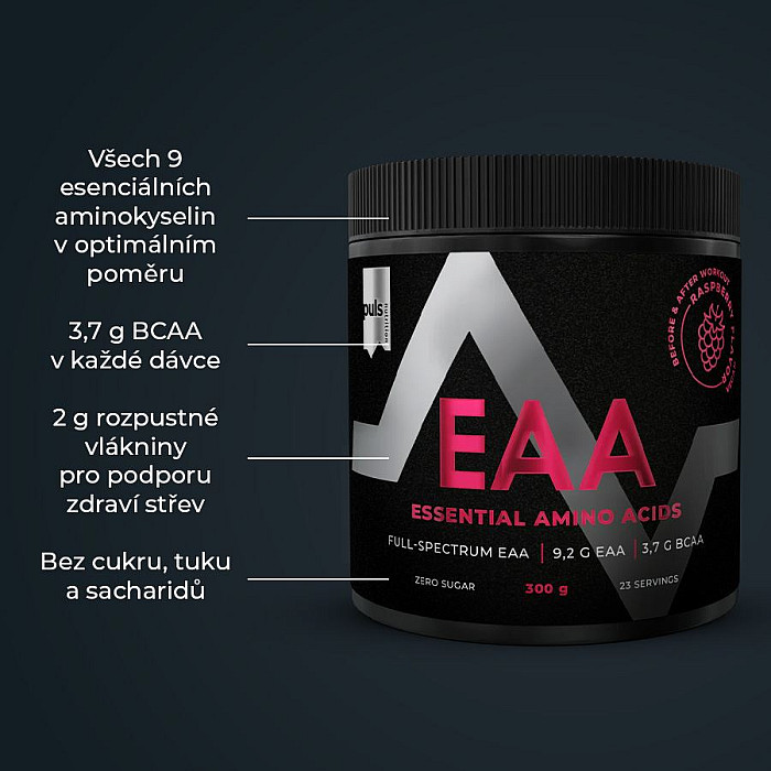 SEVERSKÁ KVALITA BEZ KOMPROMISU Podpořte růst svalů a regeneraci s naším Full-Spectrum EAA práškem. Každá porce dodá 9,2 g esenciálních aminokyselin, včetně 3,7 g BCAA, které jsou klíčové pro syntézu svalových bílkovin, výkon a ochranu svalové hmoty. Tato formule je bez cukru a je navržená tak, aby pomáhala předcházet svalovému rozpadu, zvyšovala výkonnost a urychlovala regeneraci. Osvěžující malinová příchuť potěší bez zbytečných kalorií – bez tuku a bez sacharidů. Přidaná vláknina navíc podporuje správné trávení a celkový komfort při užívání. Ideální pro užívání před, během nebo po tréninku. Pro kompletní regeneraci doporučujeme po tréninku zařadit plnohodnotné jídlo. Pokud potřebujete rychlé doplnění živin, sáhněte ihned po tréninku po proteinovém nebo regeneračním nápoji, který pomůže doplnit zásoby bílkovin a glykogenu. Full-Spectrum EAA – čistá podpora výkonu, ochrana svalů a rychlejší regenerace. Žádné kompromisy z hlediska jedinečné chuti a složení. Finská značka PULS NUTRITION patří ve všech ohledech k absolutní špičce sportovní a doplňkové výživy.