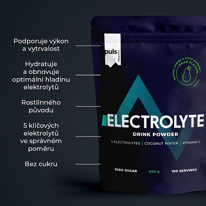SEVERSKÁ KVALITA BEZ KOMPROMISU Optimalizujte hydrataci a výkon. PULS Electrolyte prášek je ideálním řešením pro udržení správné hydratace. Tato formule bez obsahu cukru poskytuje dokonale vyváženou směs pěti esenciálních elektrolytů – hořčíku, vápníku, draslíku, chloridu a sodíku – tedy klíčových minerálů nezbytných pro udržení optimální rovnováhy tekutin a podporu svalové funkce při intenzivní aktivitě. Smíchejte s vodou a vychutnejte si osvěžující hruškovou chuť. Lze užívat během nebo po tréninku, při fyzicky náročném pracovním dni, po saunování nebo v horkých dnech. Obohaceno o kokosovou vodu CocoMineral® a vitamin C. Minerály z kokosové vody podporují efektivní hydrataci, vitamin C přispívá k normálnímu energetickému metabolismu a pomáhá udržovat správnou funkci imunitního systému během i po náročném fyzickém výkonu. Veganské složení se snadno hodí do jakéhokoli stravovacího režimu a poskytuje důležitou podporu hydratace bez zbytečných kalorií či přísad. Pro komplexní výživu při tréninku zvažte kombinaci s aminokyselinami EAA nebo BCAA+, které podporují svalovou funkci a regeneraci při zachování optimální elektrolytové rovnováhy. Žádné kompromisy z hlediska jedinečné chuti a složení. Finská značka PULS NUTRITION patří ve všech ohledech k absolutní špičce sportovní a doplňkové výživy.