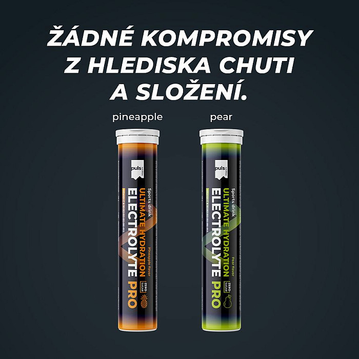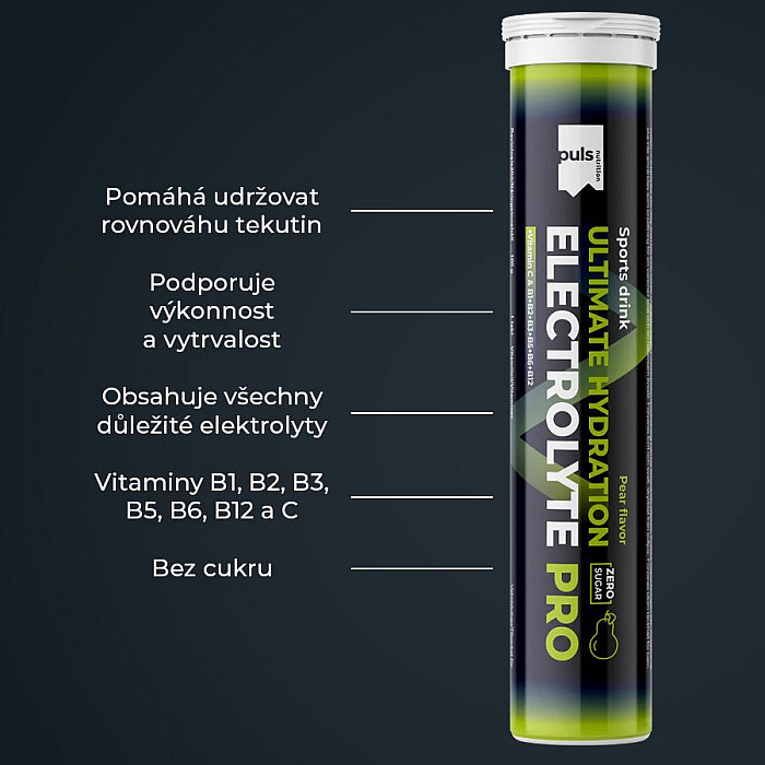 SEVERSKÁ KVALITA BEZ KOMPROMISU Hydratace jednoduše. Šumivá tableta PULS Electrolyte PRO představuje efektivní způsob, jak zahnat žízeň a rychle podpořit rovnováhu tekutin v těle. Stačí rozpustit ve vodě a vychutnat si sladkou hruškovou chuť bez cukru. Hotový hydratační nápoj obsahuje všechny důležité elektrolyty a také vitaminy C, B1, B2, B3, B5, B6 a B12. Je navržen pro podporu výkonu a vytrvalosti. Obsahuje hořčík, který přispívá k normální činnosti svalů a pomáhá snižovat míru únavy a vyčerpání. Vitaminy B1, B3, B6 a B12 přispívají k normálnímu energetickému metabolismu a k normální činnosti nervové soustavy.