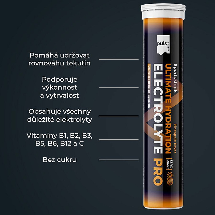 SEVERSKÁ KVALITA BEZ KOMPROMISU Hydratace jednoduše. Šumivá tableta PULS Electrolyte PRO představuje efektivní způsob, jak zahnat žízeň a rychle podpořit rovnováhu tekutin v těle. Stačí rozpustit ve vodě a vychutnat si sladkou ananasovou chuť bez cukru. Hotový hydratační nápoj obsahuje všechny důležité elektrolyty a také vitaminy C, B1, B2, B3, B5, B6 a B12. Je navržen pro podporu výkonu a vytrvalosti. Obsahuje hořčík, který přispívá k normální činnosti svalů a pomáhá snižovat míru únavy a vyčerpání. Vitaminy B1, B3, B6 a B12 přispívají k normálnímu energetickému metabolismu a k normální činnosti nervové soustavy.
