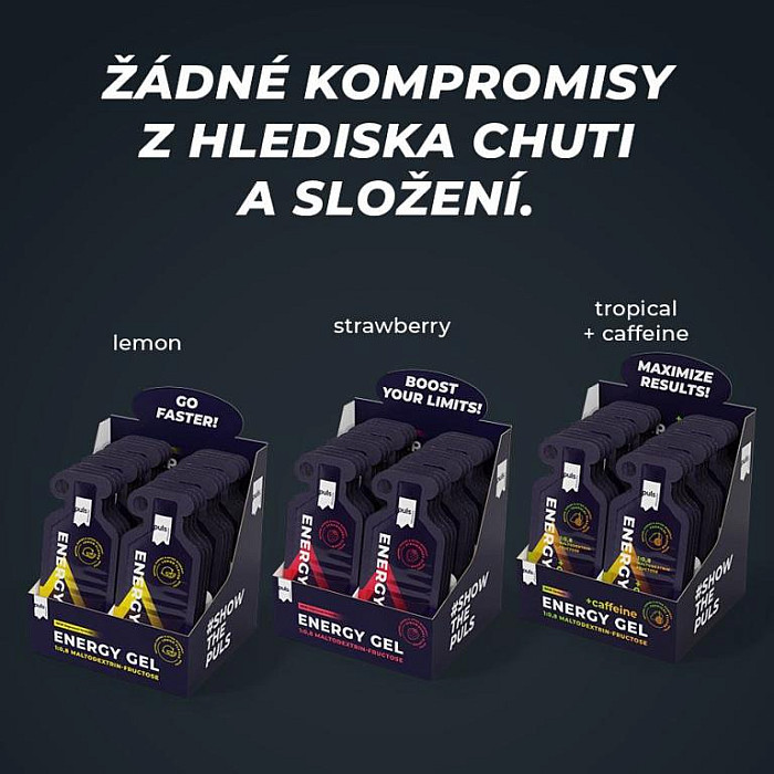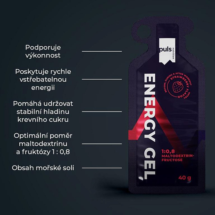 Podpora pro vytrvalostní výkon. Puls Energy Gel vás udrží v tempu i během dlouhých běhů. Díky optimálnímu poměru maltodextrinu a fruktózy 1 : 0,8 se gel rychle vstřebává a poskytuje okamžitý přísun energie. Obsahuje mořskou sůl s nejdůležitějšími elektrolyty. Praktické jednorázové balení umožňuje snadnou konzumaci kdykoli na cestách. Puls Energy Gel podporuje výkon při vytrvalostních sportech s dlouhým trváním, jako je běh, cyklistika nebo triatlon. Osvěžující jahodová příchuť.