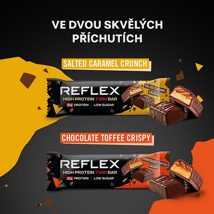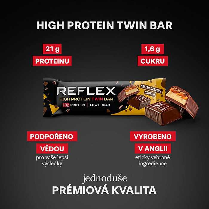 Twin Bar obsahuje proteinovou směs - mléčný proteinový izolát, sojový proteinový izolát a syrovátkový proteinový izolát, je slazená maltitolem a stévií. Reflex High Protein Twin Bar nabízí vše, co od kvalitní tyčinky očekáváte: vysoký obsah bílkovin, nízký obsah cukru a žádné konzervanty, umělá aromata ani barviva. Skvělá volba pro sportovce i aktivní životní styl.