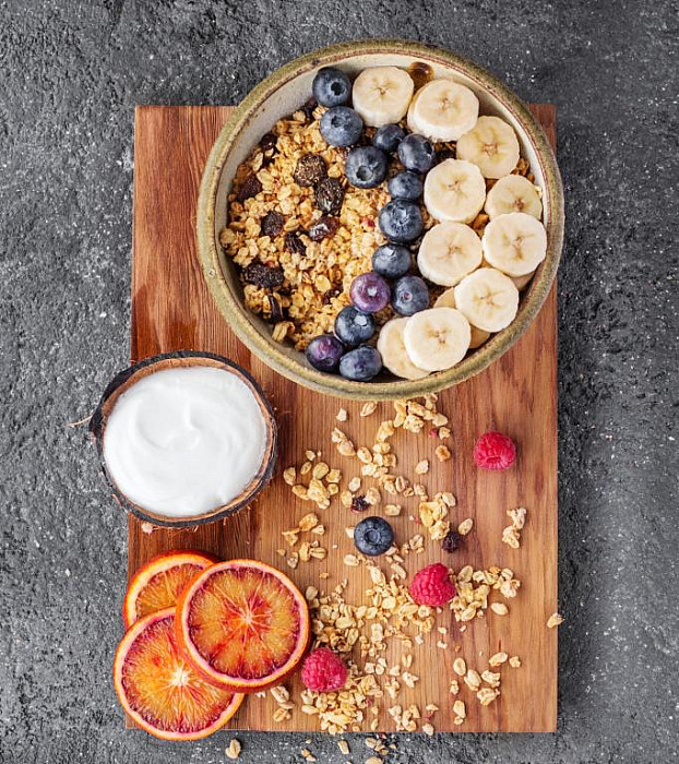 Hotovou kaši přelijeme do misky a ozdobíme oříškovým máslem, čerstvým ovocem a křupavými oříšky.