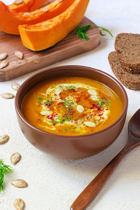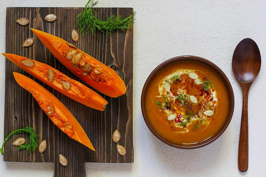 Uvařenou polévku rozmixujeme dohladka, případně doladíme konzistenci podle chuti. Podáváme ji s pečenou cizrnou a mrkví, posypanou semínky nebo oříšky. Skvěle chutná i s čerstvým pečivem.
