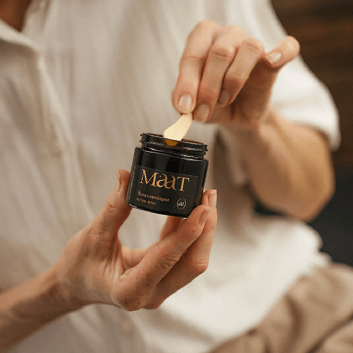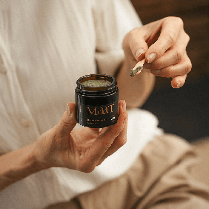 Vyživující maska s chlorellou a moringou regeneruje, zpevňuje a obnovuje vitalitu pleti. Bambucké a kakaové máslo spolu s brusinkovým, šípkovým a arganovým olejem pleť hloubkově vyživují a zklidňují. Jemná bylinná vůně podporuje uvolnění a přirozeně nastartuje očistné procesy.