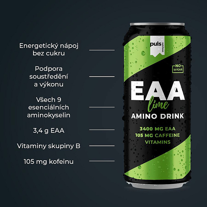 Funkční Amino Energy. Energie a výkon s limetkovým nádechem – dopřejte si pořádnou vzpruhu s naším nejnovějším EAA nápojem. Tento energetický nápoj bez cukru obsahuje výrazných 105 mg kofeinu, 3,4 g EAA a vitamíny skupiny B. Je navržen tak, aby podpořil výkon, vytrvalost a pomohl snížit únavu a vyčerpání. Kofein přispívá ke zvýšení vytrvalostního výkonu a vytrvalostní kapacity a pomáhá zlepšit soustředění. Vitaminy B6 a B12 podporují normální energetický metabolismus a přispívají ke snížení míry únavy a vyčerpání. Žádné kompromisy z hlediska jedinečné chuti a složení. Finská značka PULS NUTRITION patří ve všech ohledech k absolutní špičce sportovní a doplňkové výživy.