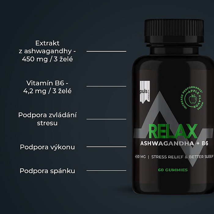 SEVERSKÁ KVALITA BEZ KOMPROMISU Odbourejte stres a zůstaňte v klidu. Tyto lahodné PULS gummies s ashwagandhou mají sladkou jablečnou příchuť a obsahují vysoce kvalitní extrakt z kořene ashwagandhy. Ashwagandha pomáhá podporovat odolnost vůči stresu, zlepšovat výkonnost a psychickou rovnováhu a zároveň podporuje kvalitu spánku. Jablečné ashwagandha gummies navíc obsahují vitamin B6. Vitamin B6 přispívá k normálnímu energetickému metabolismu, psychické činnosti a pomáhá snižovat únavu a vyčerpání.