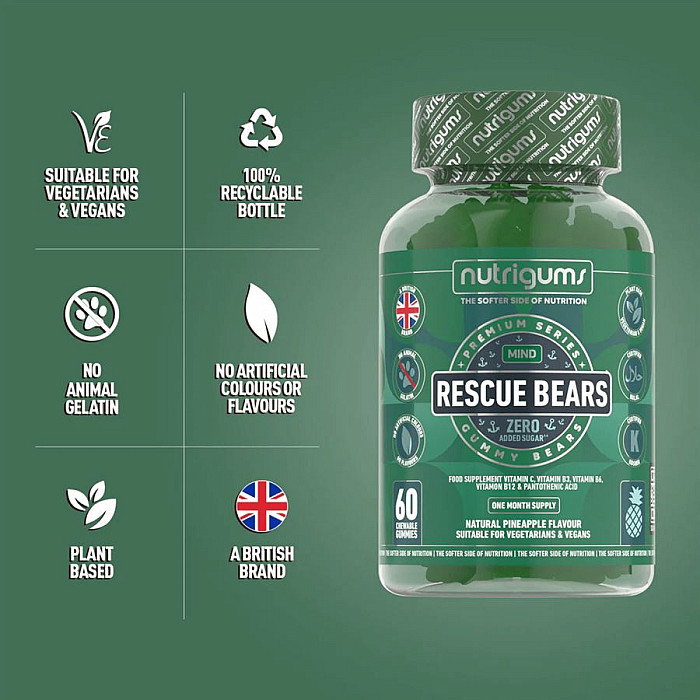 RESCUE BEARS (Žvýkací želé při stresu a úzkosti) Doplněk stravy. - Žvýkací želé při nadměrném psychickém zatížení a stresu- Pro normální fungování nervové soustavy- Přírodní ananasová příchuť- Bez umělých sladidel a barviv- Extrakt z meduňky, extrakt z heřmánku, extrakt ze zeleného čaje- Aminokyseliny glycin a taurin- Jód, zinek- B-komplex s vysokým obsahem vitamínu B12- Bioaktivní formy obsažených látek- Vhodné pro vegetariány i vegany Vitamínová želé nemusí být plná umělých sladidel a barviv! Jde si pochutnat i bez syntetických látek. Želé Nutrigums® Rescue Bears mají lahodnou přírodní ananasovou příchuť a lehce se konzumují. Tělu dodává všechny benefity extraktu z meduňky, heřmánku a zeleného čaje, které mají vlastnosti související se stresem, úzkostí a nervozitou (činností nervové soustavy). Jejich účinek doplňují glycin a taurin, vitamíny skupiny B, jejichž vlastnosti souvisí také s nervovou soustavou, jód a zinek, jejichž vlastnosti souvisí s neurotransmiterem GABA. NUTRIGUMS® = ŽELÉ S BIOAKTIVNÍMI SLOŽKAMI, EXTRAKTY, VITAMÍNY A MINERÁLYNUTRIGUMS® = ŽELÉ BEZ UMĚLÝCH SLADIDEL A BARVIVNUTRIGUMS® = ŽELÉ VHODNÉ PRO VEGETARIÁNY I VEGANY Bioaktivní látky ve 2 želé: - Extrakt z květu heřmánku 4:1 (ekvivalent k 8 mg květů heřmánku) - 2 mg- Extrakt z meduňky lékařské 10:1 (ekvivalent k 25 mg meduňky) - 2,5 mg - Extrakt ze zeleného čaje (poskytuje 3,5 mg polyfenolů, poskytuje 1 mg EGCE (epigallokatechin-3-gallát) ) - 10 mg - Glycin - 100 mg- Taurin - 50 mg- Jód - 75 µg- Zinek - 5 mg- Vitamín B3 (nikotinamid) - 8 mg NE- Vitamín B5 - 3 mg- Vitamín B6 - 0,7 mg- Vitamín B12 (kyanokobalamin) - 250 µg- Kyselina listová (pteroylmonoglutamová kyselina) - 100 µg- Biotin - 25 µg
