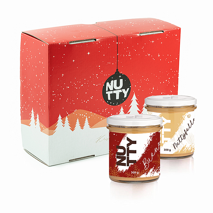 Vánoční balíček se dvěmi vánočními másly - NUTTY Bueno a Nuttyfello. Obě skleničky mají tématickou etiketu a ani s jedním nešlápnete vedle.