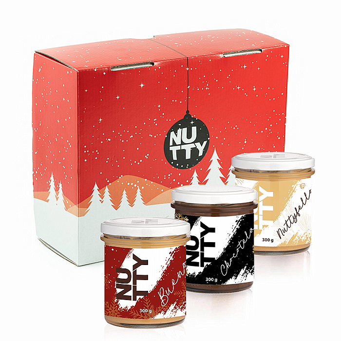 Vánoční balíček se třemi nejoblíbenějšími másly - NUTTY Bueno, Chocotela a Nuttyfello. Všechny mají tématickou etiketu a ani s jedním nešlápnete vedle.